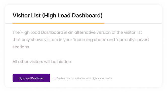 During heavy traffic (5,000+ visitors), Chattrik’s High Load Dashboard keeps things fast by showing only incoming and active chats. Enable it in Settings > Account > Visitor List, and your dashboard will auto-optimize to maintain smooth performance.
