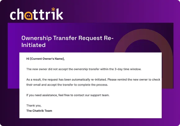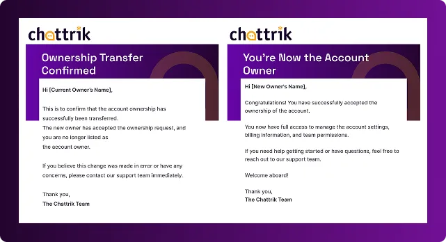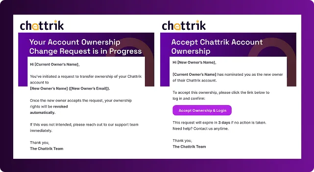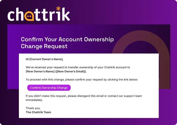 Changing the account owner at Chattrik is a simple and secure process designed to ensure smooth transfer of ownership. Through your account settings, you can initiate the transfer, confirm it via email, and provide the new owner’s details. Both current and new owners receive confirmation emails for transparency. With step-by-step verification, password setup, and email confirmations, Chattrik ensures that ownership changes are handled safely, efficiently, and without disruption.