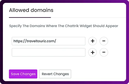 The Allowed Domains setting in Chattrik lets you specify the websites where your widget should be active. This prevents unauthorized embedding of your widget on other sites, reducing security risks and ensuring chats are initiated only through trusted sources. By restricting widget visibility to approved domains, you maintain tighter control over visitor interactions, protect your brand’s credibility, and enhance overall data security.