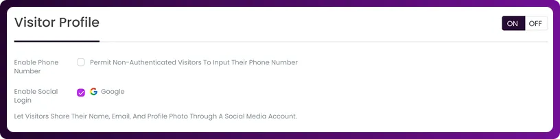 Chattrik’s Visitor Profile allows you to gather critical visitor information before interactions begin, enabling better personalization and efficient support. You can allow visitors to share their phone numbers and connect via social logins, such as Google or Facebook, making it easier to identify and engage them. These settings help your team track visitor activity, streamline responses, and improve lead management while keeping data collection simple and secure.