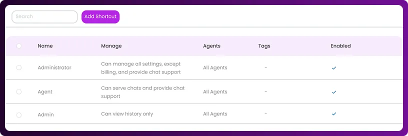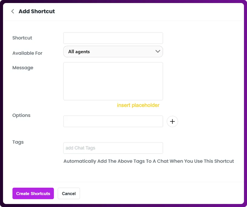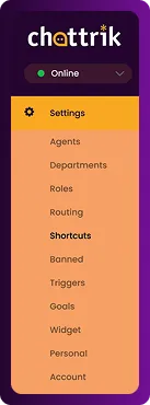 Creating shortcuts in Chattrik helps agents respond faster and maintain consistent communication with visitors. Instead of typing the same replies repeatedly, you can build pre-written responses for common questions. Shortcuts can be customized with names, permissions, messages, options, and tags, ensuring they’re tailored to your team’s workflow. This feature not only reduces response time but also improves accuracy, agent productivity, and customer satisfaction. Follow the steps below to create and manage your shortcuts effectively.