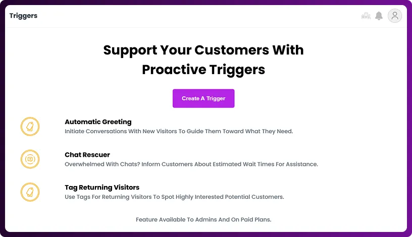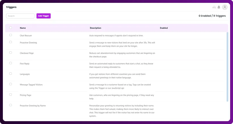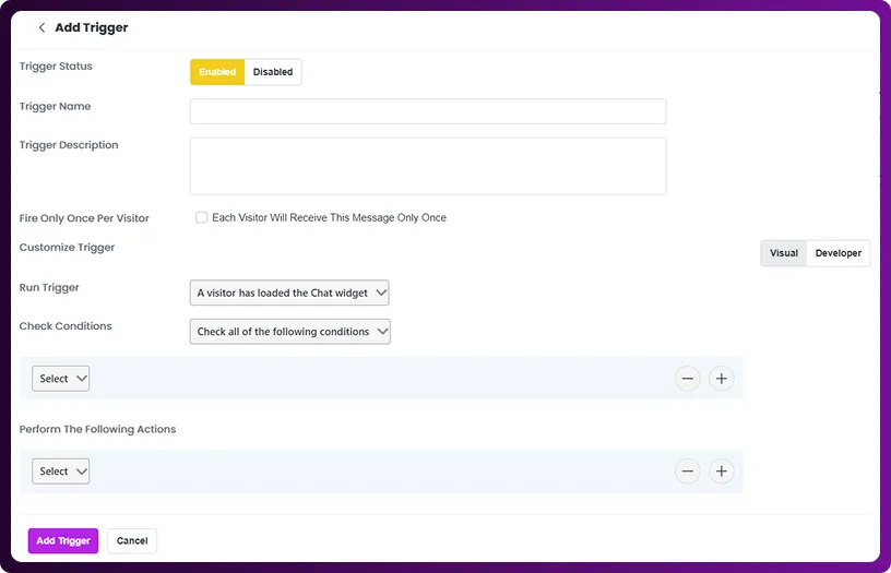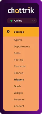 Triggers are powerful automation tools in Chattrik that allow you to interact with visitors at the right time. By creating rules and conditions, you can automatically send targeted messages, offer help, or capture leads without manual effort. Each trigger can be customized with a name, description, frequency, and display settings to match your needs. This feature helps improve efficiency, visitor engagement, and customer satisfaction by ensuring timely, relevant interactions.