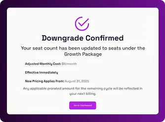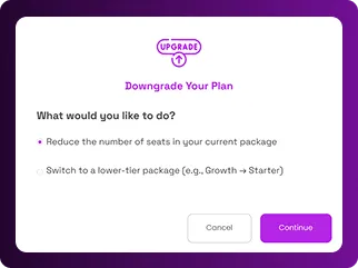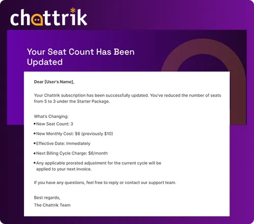 Downgrading your package within the same plan on Chattrik is quick and flexible. If your team size decreases or you need fewer seats, you can easily adjust your subscription without changing your core plan. The downgrade process allows you to reduce seats, confirm changes instantly, and receive an email confirmation for transparency. This ensures that your Chattrik subscription always aligns with your current requirements while keeping the features you value.