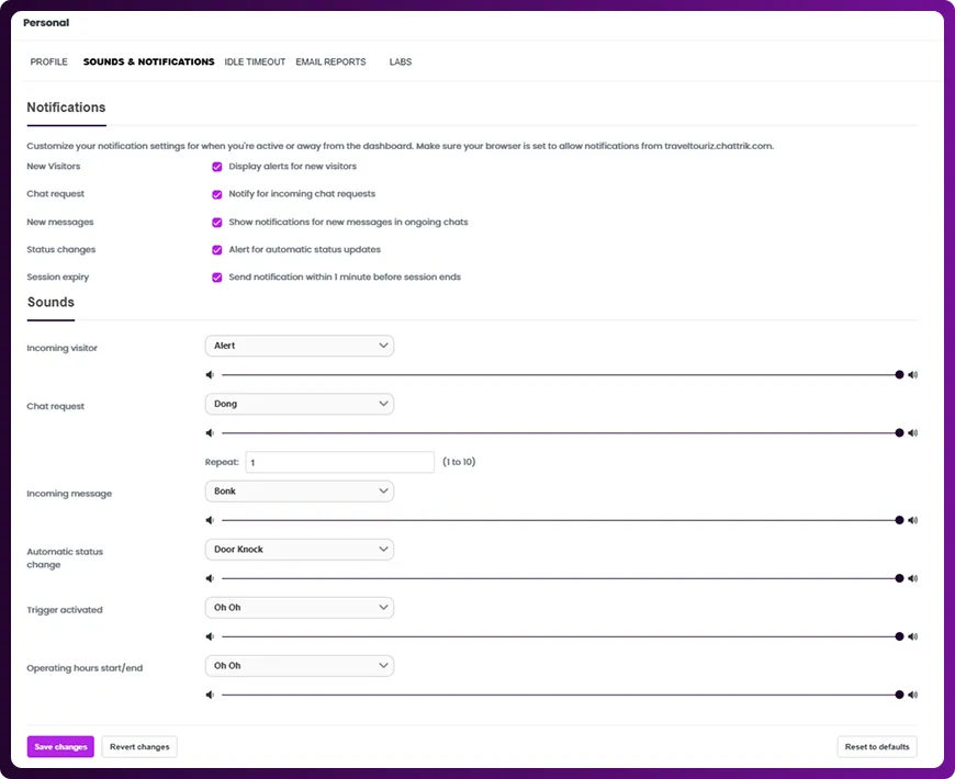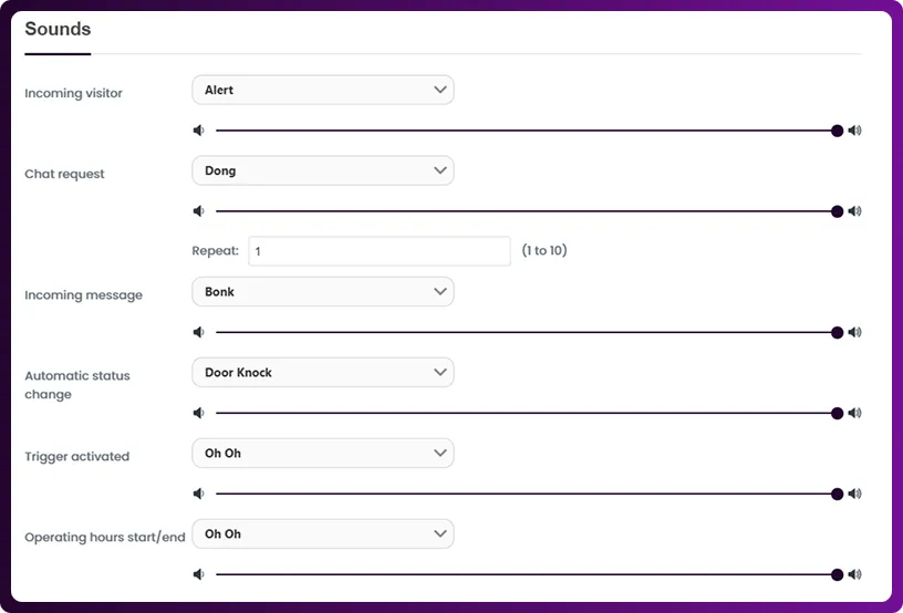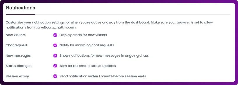 Chattrik allows you to personalize how you receive alerts and sounds, ensuring you never miss important updates while avoiding unnecessary distractions. From the notification section, you can enable or disable alerts for new visitors, chat requests, new messages, status changes, and session expiry reminders. In the sound section, you can adjust volume levels and choose different tones for visitor activity and system events. These settings make your workflow more efficient and tailored.
