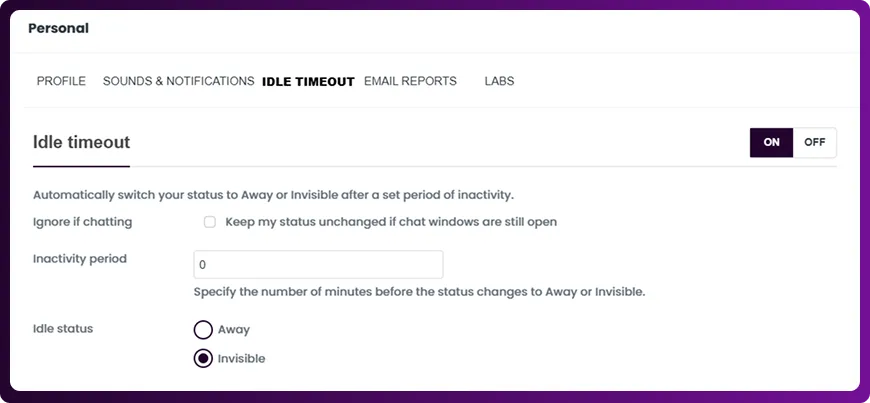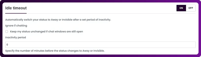 The Idle Timeout feature in Chattrik helps you control your online presence by automatically updating your status after a set period of inactivity. You can decide whether your status remains unchanged if chat windows are open or switch to Away or Invisible after a custom inactivity duration. This ensures that visitors and teammates always see your correct availability. With flexible options, you can balance responsiveness and control with ease.