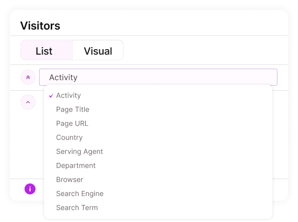 Shows the visitor’s name or identifier along with their live activity status.