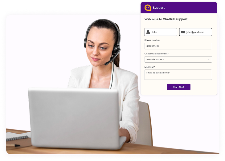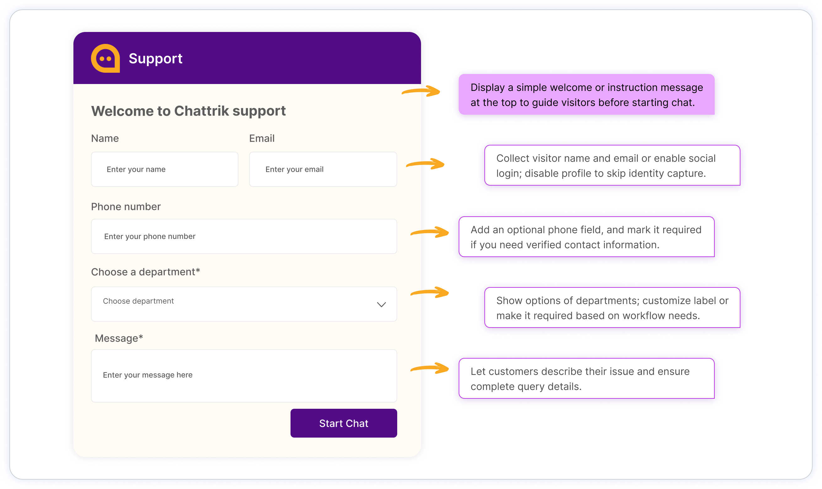 A pre-chat form is a short, customizable form that appears before a live chat starts. It helps you gather essential visitor details—such as name, email, phone number, and inquiry type—so your team can provide faster, more personalized support. With structured inputs and smart data collection, pre-chat forms ensure that every conversation begins with clarity, context, and purpose.